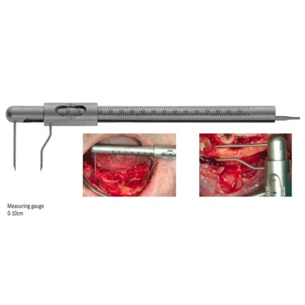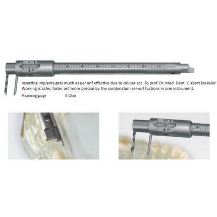 Due to the multi functional character it is very easy to set an implant. The measuring rods allow a fast and defined control of parallel and symmetrical distances between implants in distal and mesial direction. The hole at the end of the sliding calipers serves as a drilling gauge, drilling guide and depth measurements
